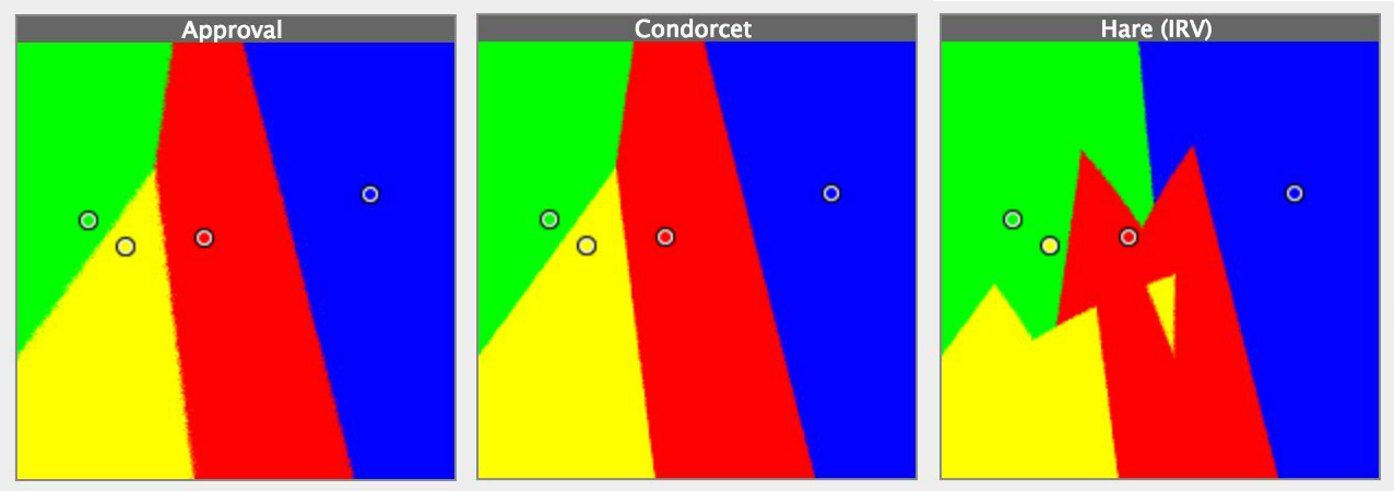 Voting Sim Visualization by Ka-Ping Yee (2005) was a real eye-opener. (hat tip to Bret Victor for sharing it with me!) I've heard lots of written debate over FPTP vs IRV vs Condorcet vs Approval vs blah blah blah, but I'd never seen their difference visualized so clearly! It gave me instant insight. And it actually changed my mind – I used to think IRV was pretty good, but after seeing IRV's messiness (as shown above), I realized it's actually kinda stinky cheese.